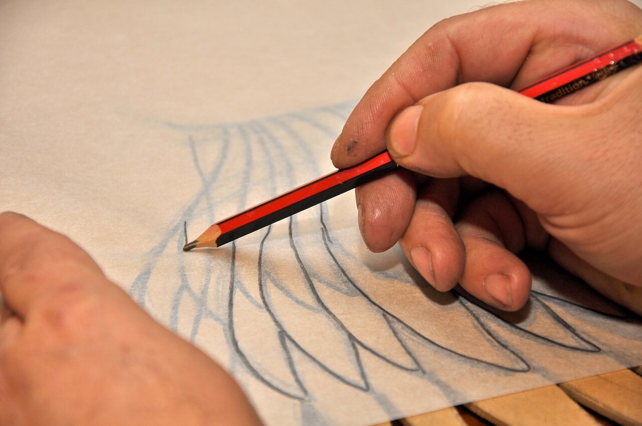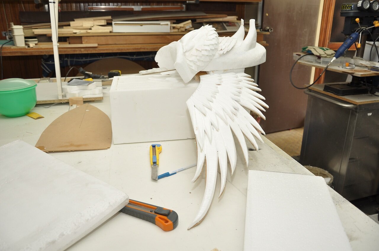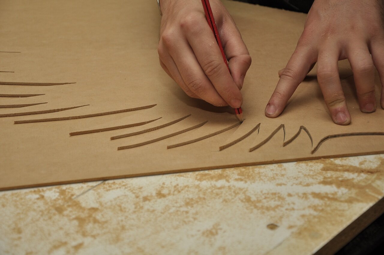 When I was happy with the wing, I simply cut out the whole wing from the MDF with a jigsaw and used it in reverse as a template for the other wing. All that was left to do was to draw the inner rows of feathers freehand inside the other wing template.