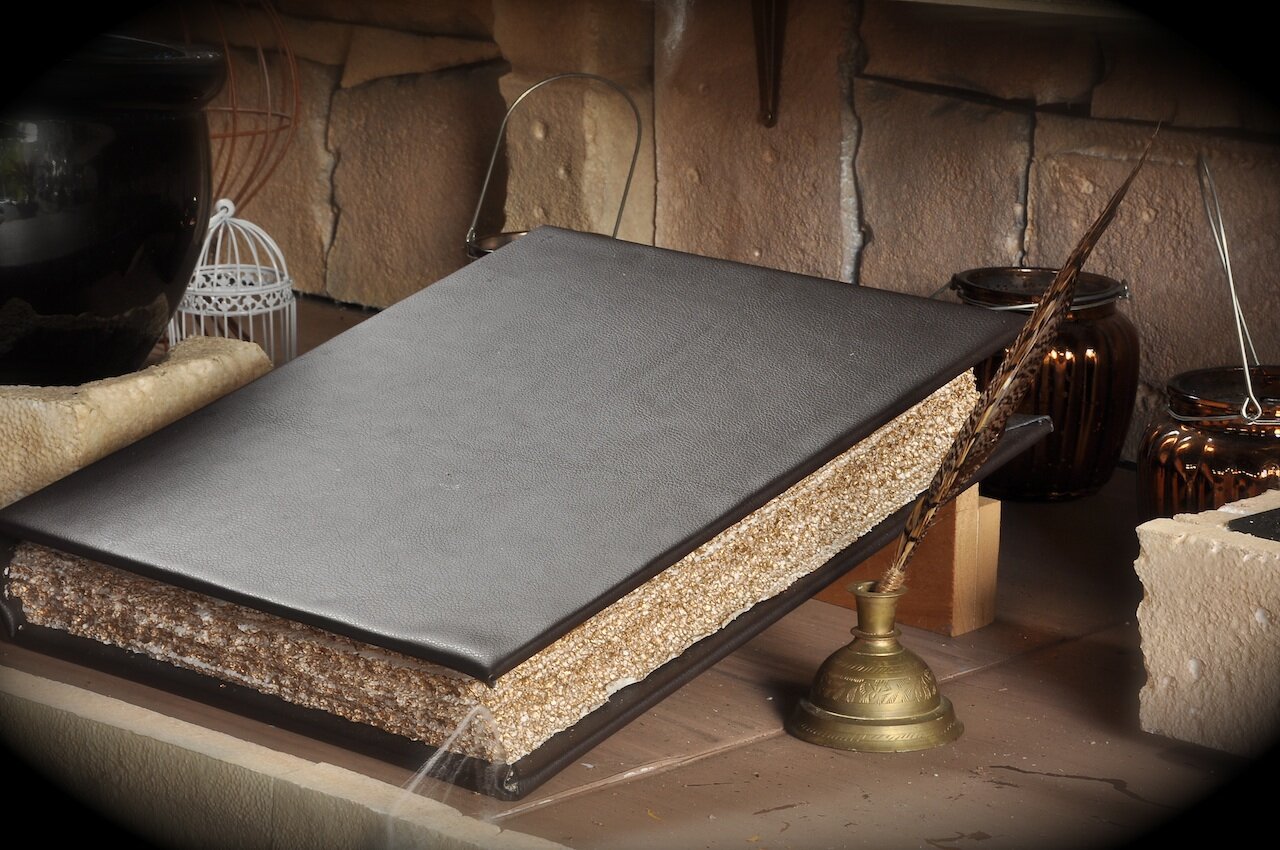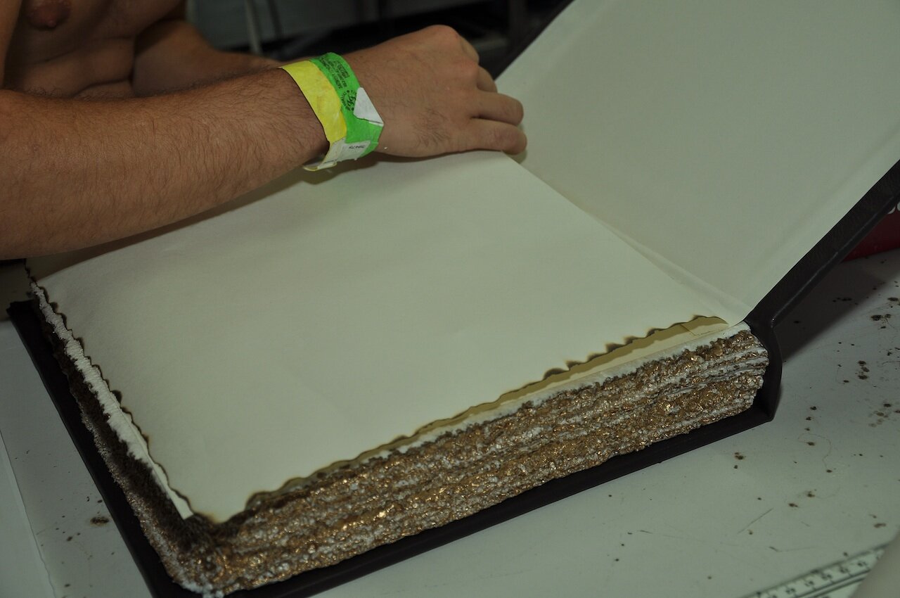Then I just sprayed gold paint on the edges of the pages from a can without sealing it first. This was because I wanted the thinners in the paint to react with the foam and eat at it leaving a old worn effect.