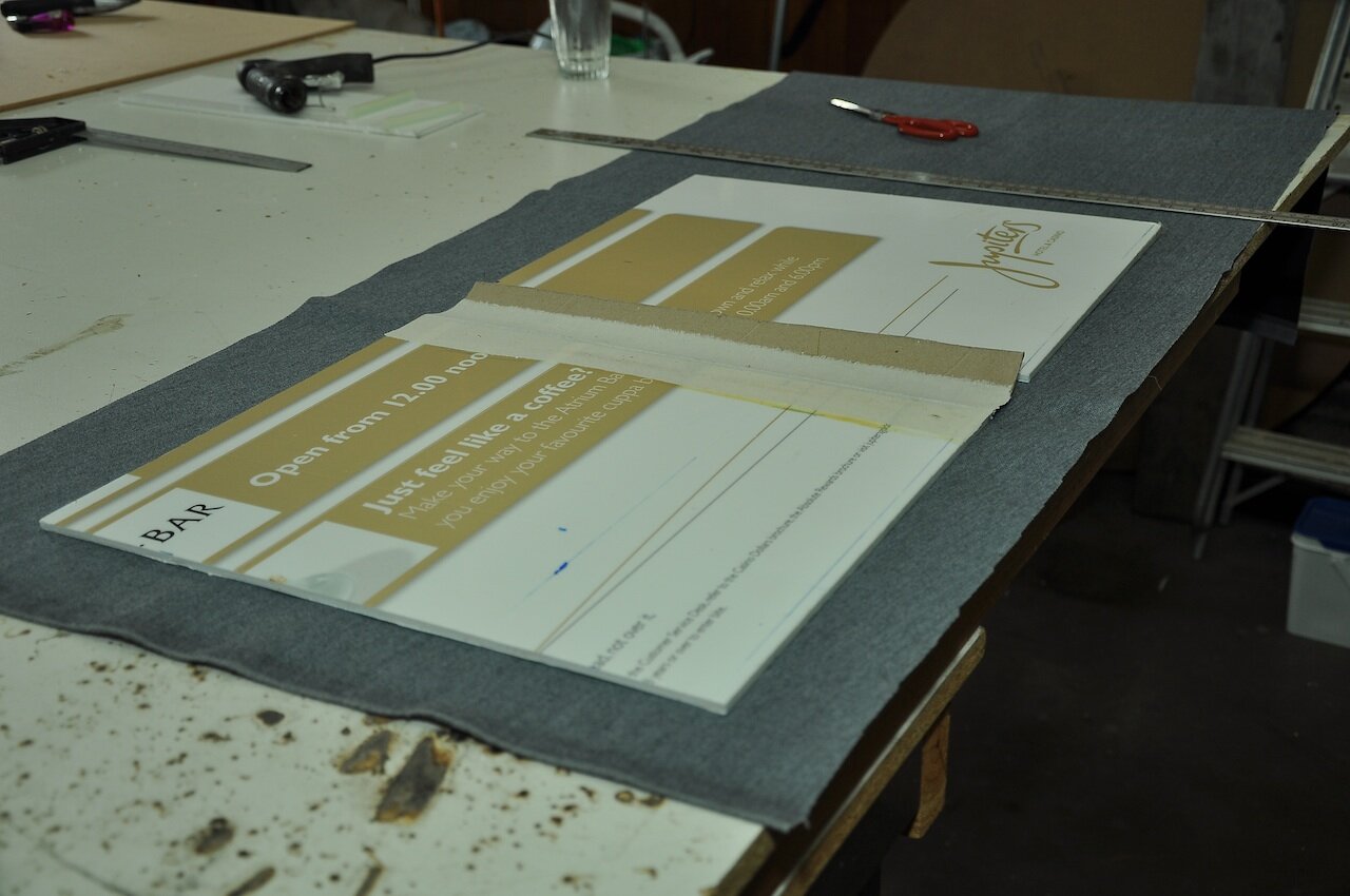 Now was the time to cut the fake leather material to cover the book, this doesn’t have to be very accurate. Next I used a black marker on the inside of the material to mark up were the back of the book, the spine and the front cover will go. We did a trial run to make sure everything folded nicely before we glued the material over the cover and spine pieces. The best glue to use for this is contact adhesive.