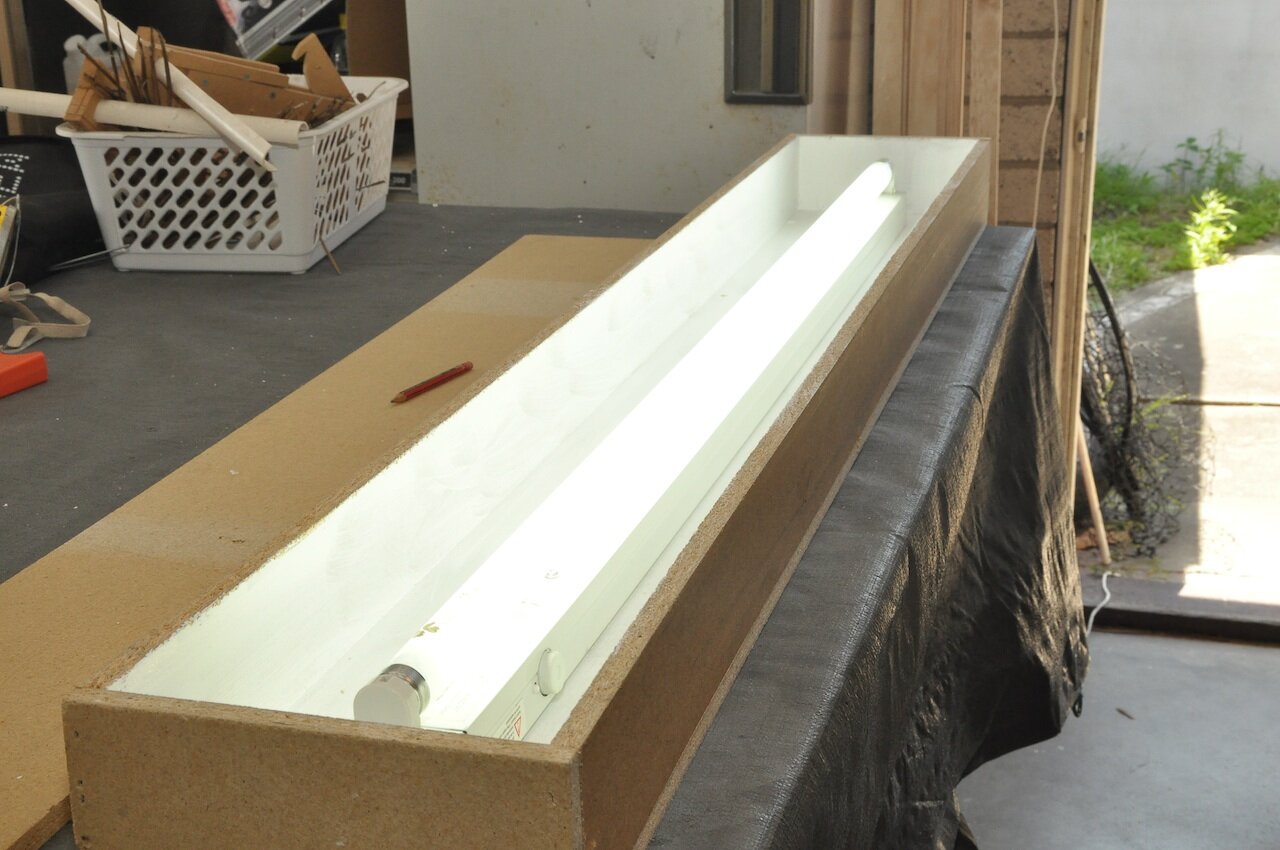I decided to make a light box the length of a standard 4ft fluorescent tube, that would be wide enough to fit two rows of bottles on it. This really was quite simple to make, I just measured the length of you light that I was using use and allowed 4” (100 mm) either side. Then I cut my timber to length and screwed them together.