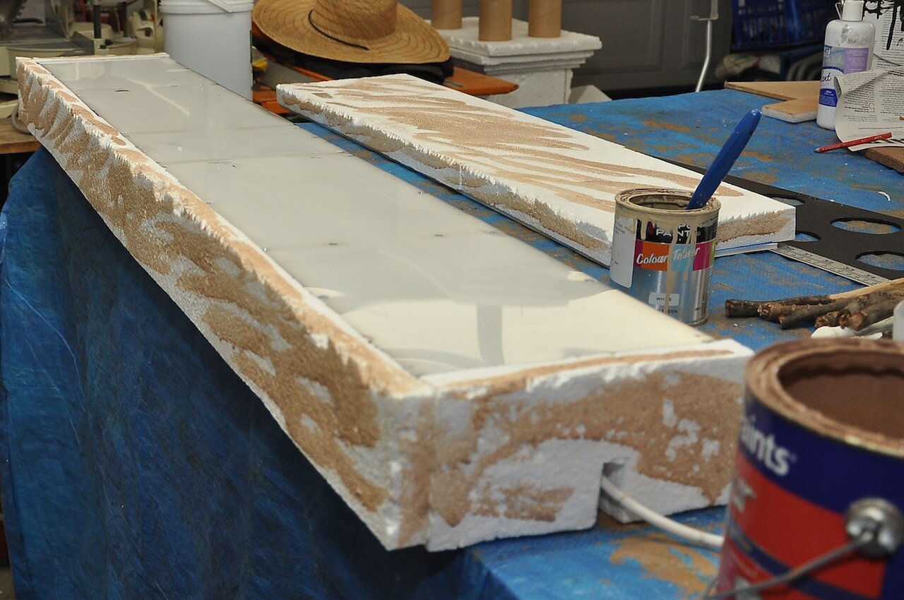 To keep with the theme of a stone castle I cut some foam and glued it to the sides. To make it look like textured stone I heated it with my heat gun as it melts it slightly giving it that stone look. Last thing was to paint it with a watered down sandy colored paint.