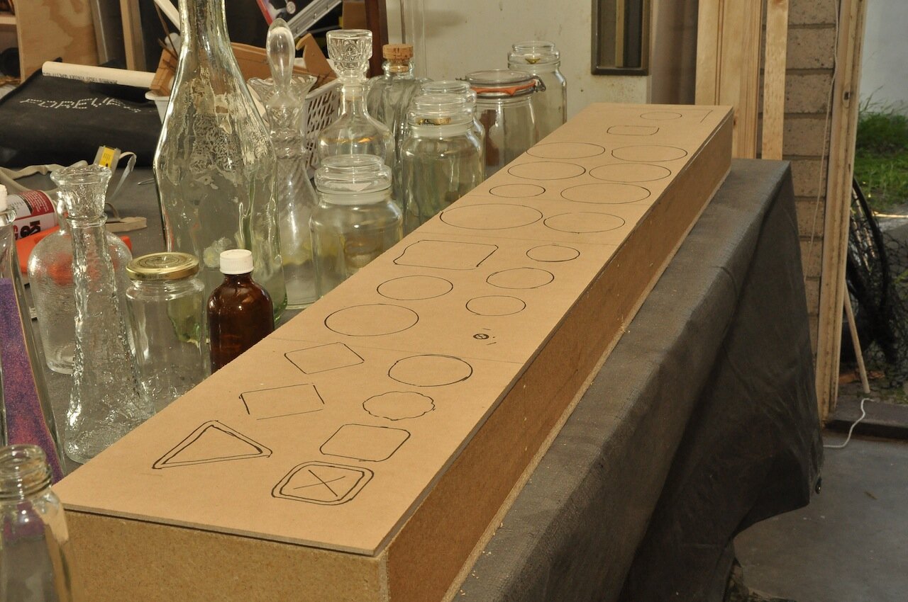 Because I only wanted to shine the light through the bottom of each bottle and not around it. I cut a piece of 1/8” (3 mm) mdf to fit the exact width of the perspex. After arranging the bottles in the order we wanted them to go, I traced around each bottle and then cut out a smaller hole with my jigsaw.