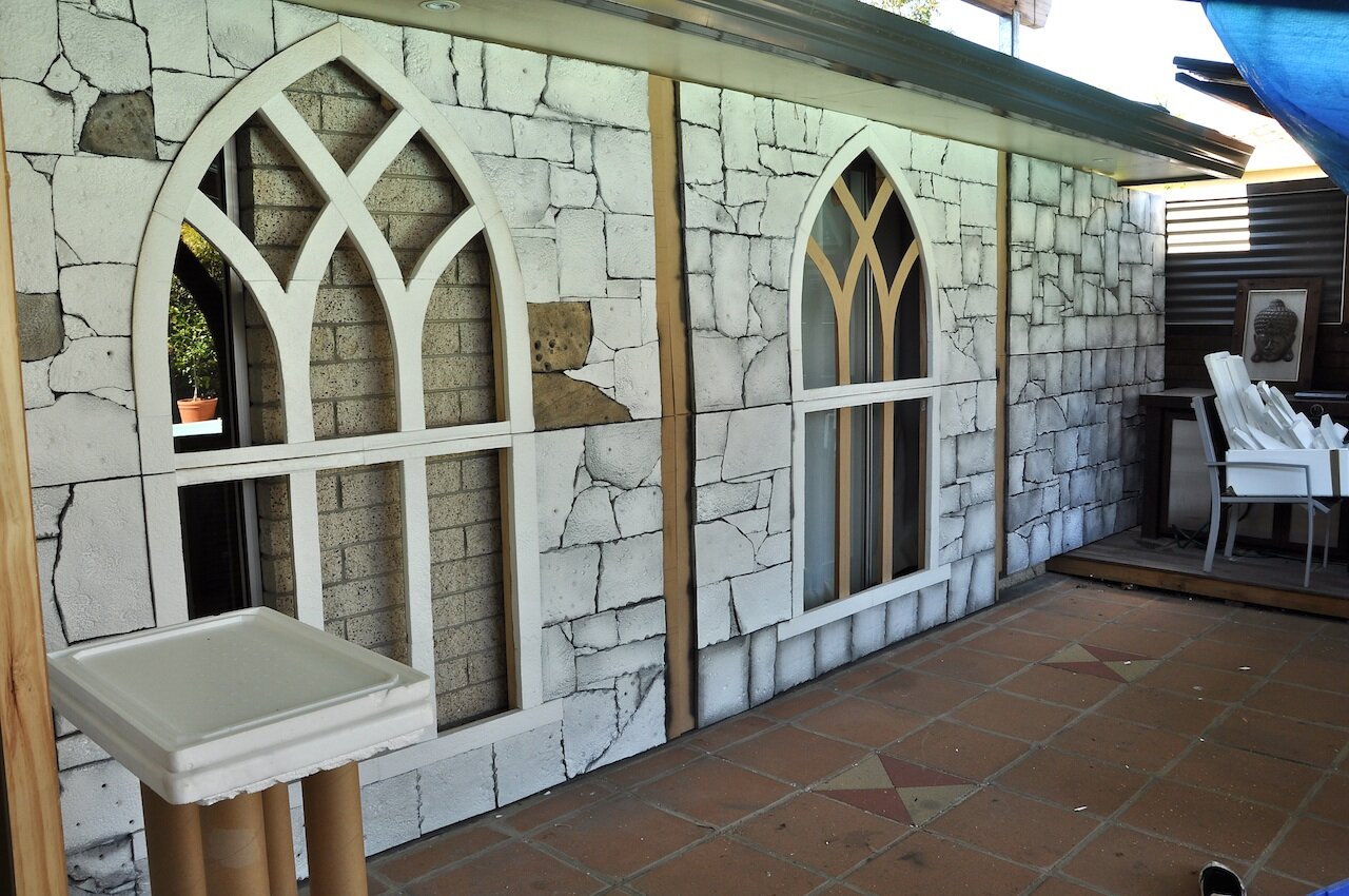 Having finished framing up the 2 sections of one side of the castle and setting them up in place, I was itching to begin the stone work. However before I could start on the stone walls, I had to glue and shape the foam around the windows, no different to building a real wall.