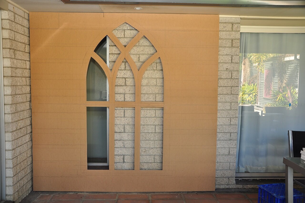 The next morning we put up the first section of the set to see how close our measurements were….. Pretty darn good, even if I do say so my self 🙂 Now the next step was to draw on the arched window for that section. How was I going to get the balance right. I had never drawn a full size gothic arch window before, but I knew it had to be balanced and look like you were really in a castle looking out onto the scenery.