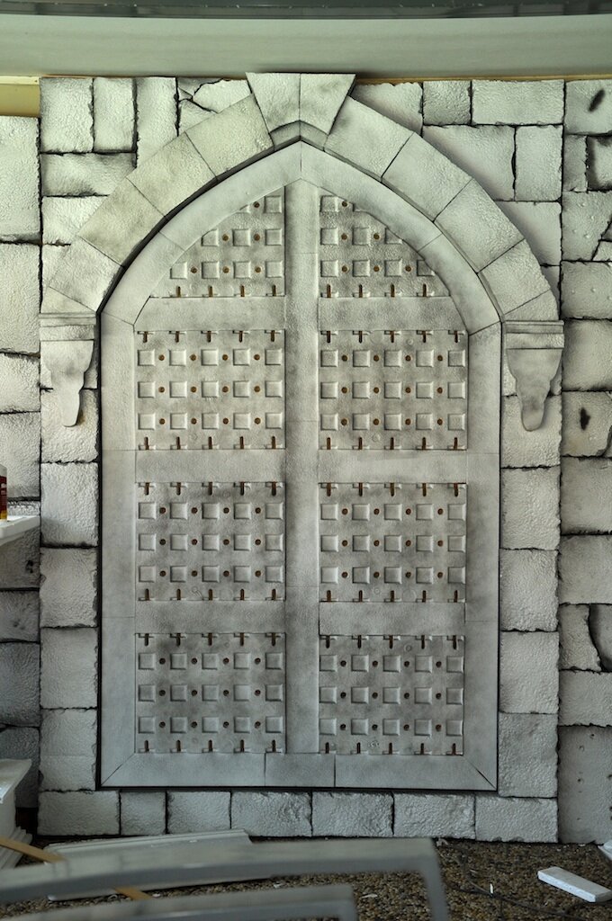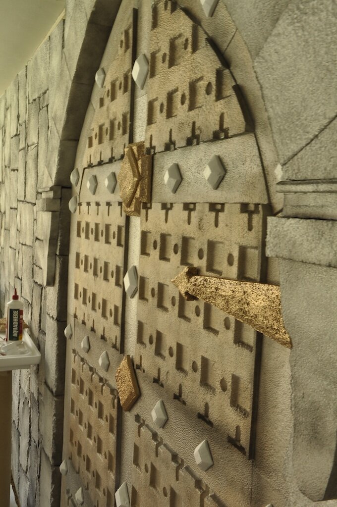The arch part was a bit challenging as I needed to keep the same width of foam as the rest but curve it around the top of the door. I used the jig that I had made for the windows and moved it around until it matched up with the curve, then I placed the jig onto my piece of foam, traced around it and cut it out.